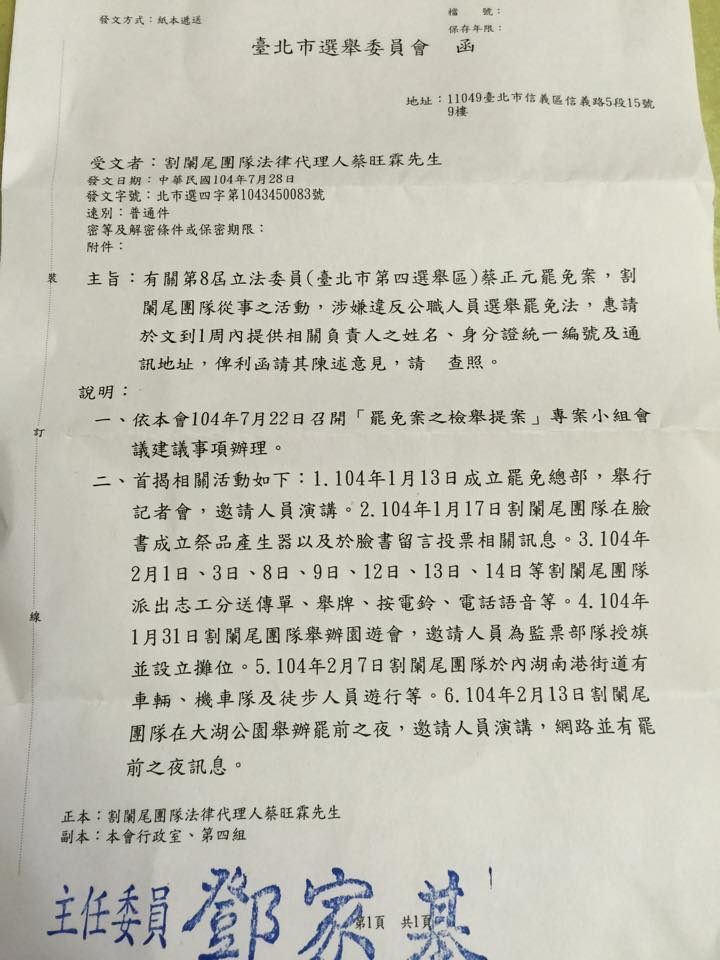 - 確認回覆台北市選委會公文內容及回覆時間。